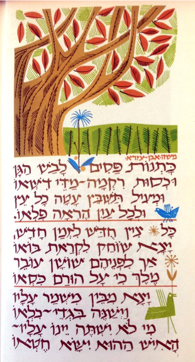 Yet there is another Moses in this Haggadah, namely, Moses Ibn-Ezra, the celebrated Hebrew poet from Granada, Spain who lived in the twelfth century. Like the editors of the Bavli, this Haggadah’s editors remain anonymous. Still, one thing we can know about them is their fondness for poetry, which is evident throughout the text. One can find piyyutim by late antique poets such as Elazar Birabi Qilir and Yose ben Yose, as well as a beautiful poem by Moses Ibn Ezra entitled כתנת פסים לבש הגן (“The garden put on a coat of many colors”). Here is the poem in the original, followed by an English translation by T. Carmi:
