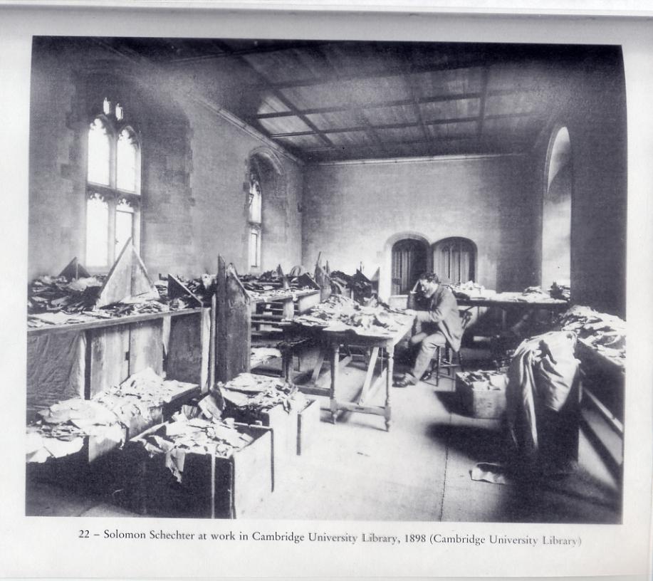 שניאור זלמן שכטר יושב כאן באולם שהקצו לו בספריה של קימברידג’, שמש בריטית עגומה מאירה מהחלונות את אוצרות הגניזה המבולגנים עדיין, חלקם עוד מונחים בתוך תיבות העץ הכבדות בהן הובאו מקהיר, חלקם כבר פרושים על השולחנות אחרי מיון ראשוני. הצלם תפס היטב את היחסים שבין שכטר לבין החלל שבו הוא נמצא. השולחנות הארוכים הללו נראים קצת כמו שולחנות של שטיבל חסידי, הדלת הכפולה מאחור כמו ארון קודש, ובכלל האולם נראה כמו בית כנסת שנותר בו רק מתפלל אחד.